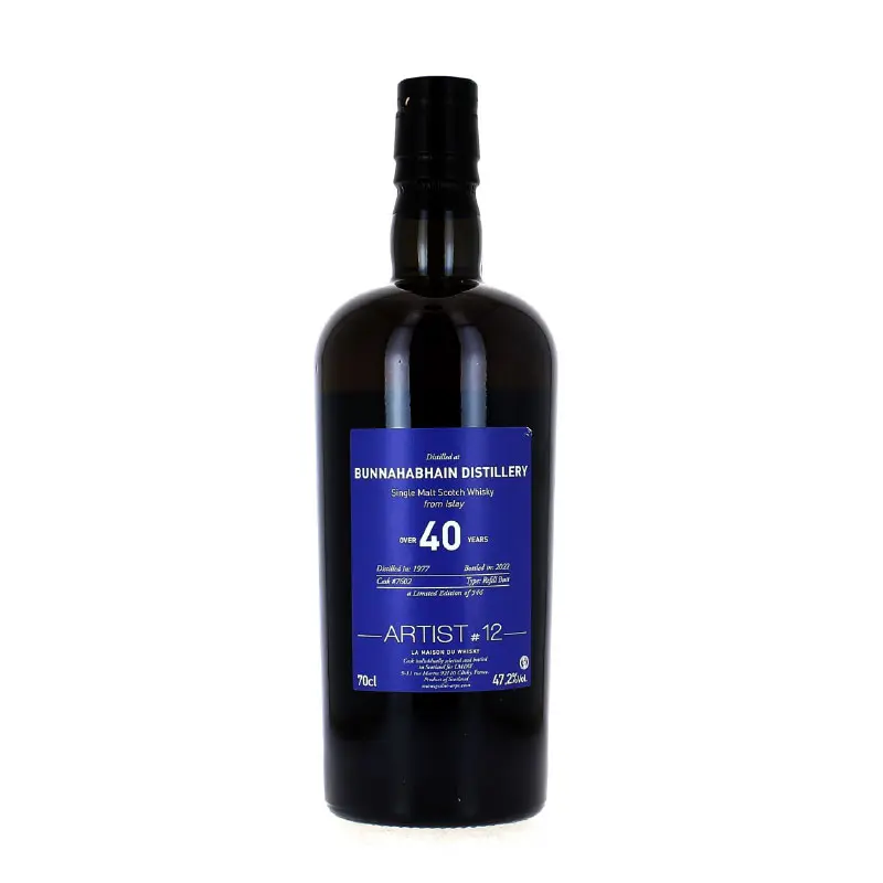 De toutes les versions sélectionnées pour la gamme Artist de La Maison du Whisky, ce Bunnahabhain détient le record du nombre d’années pas – sées en fût : 44 ans. Élaboré à une époque où cette distillerie produisait un whisky pas ou très peu tourbé, il est cependant représentatif des single malts de l’île d’Islay. Son caractère profondément salin et sa rétroolfaction intensément tourbée en sont une preuve irréfutable. Par ail – leurs, d’un charme fou et d’une ex – trême volupté, sa palette aromatique et gustative fait preuve d’une remarquable unité de ton à l’image des tonalités réglissées qui unissent pro – fondément la bouche et la finale.